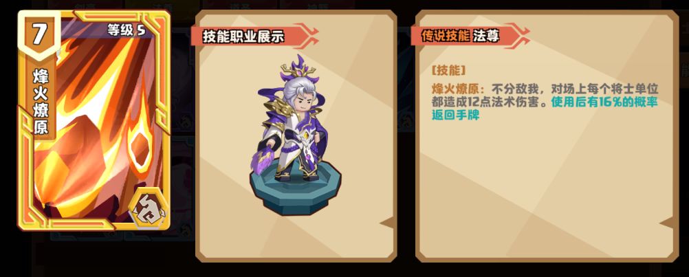 等级5的【烽火燎原】:不分敌我,对场上每个将士单位都造成12点伤害。使用后有16%的概率返回手牌。
