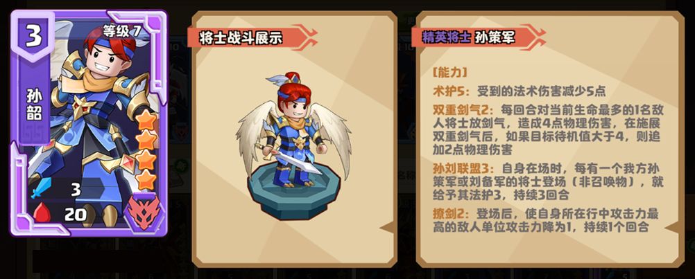 2.孙韶:还有一个觉醒神将星酱要在这里推荐一下!当孙韶满级后,即可使用觉醒书和素材获得觉醒孙韶。觉醒孙韶获得的新能力【孙刘联盟】:自身在场时,每有一个我方孙策军或刘备军的将士登场(非召唤物),就给予其【术护3】,持续3回合。