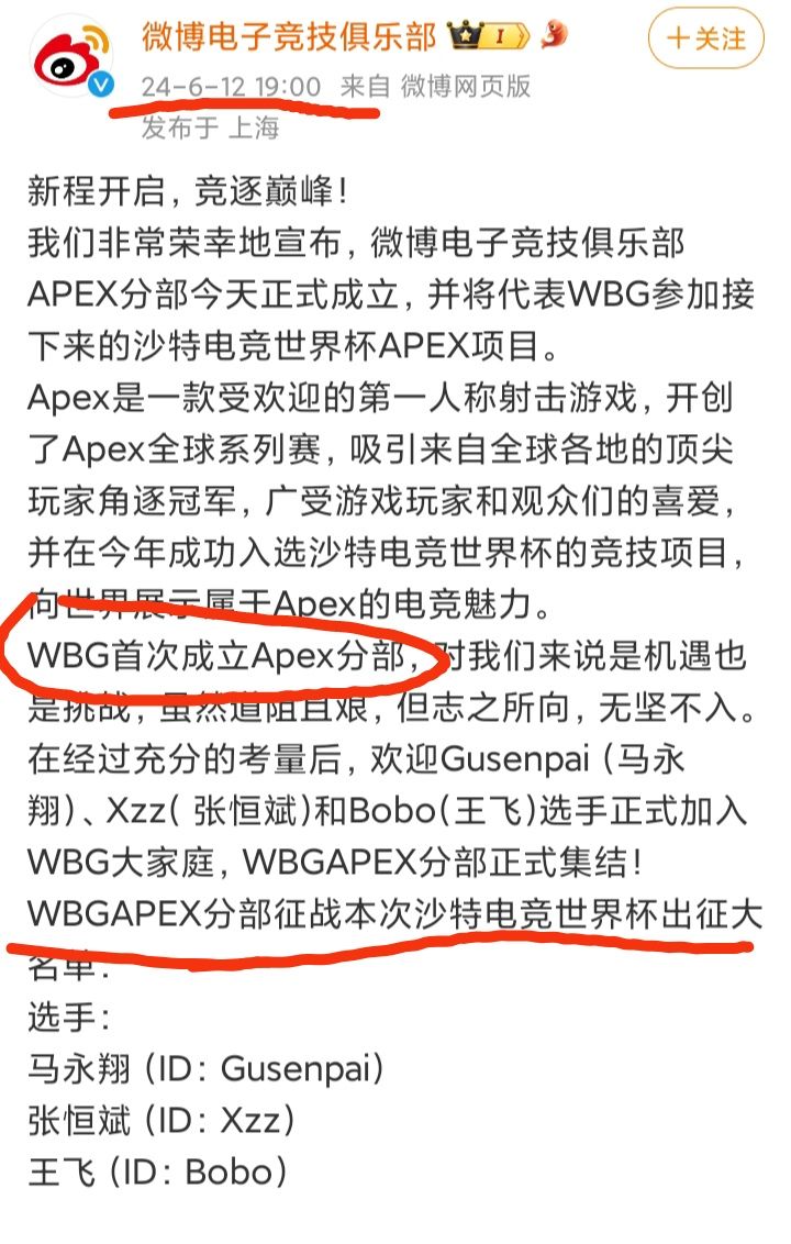 微博官宣成立APEX分部,出征沙特电竞杯❗❗❗
