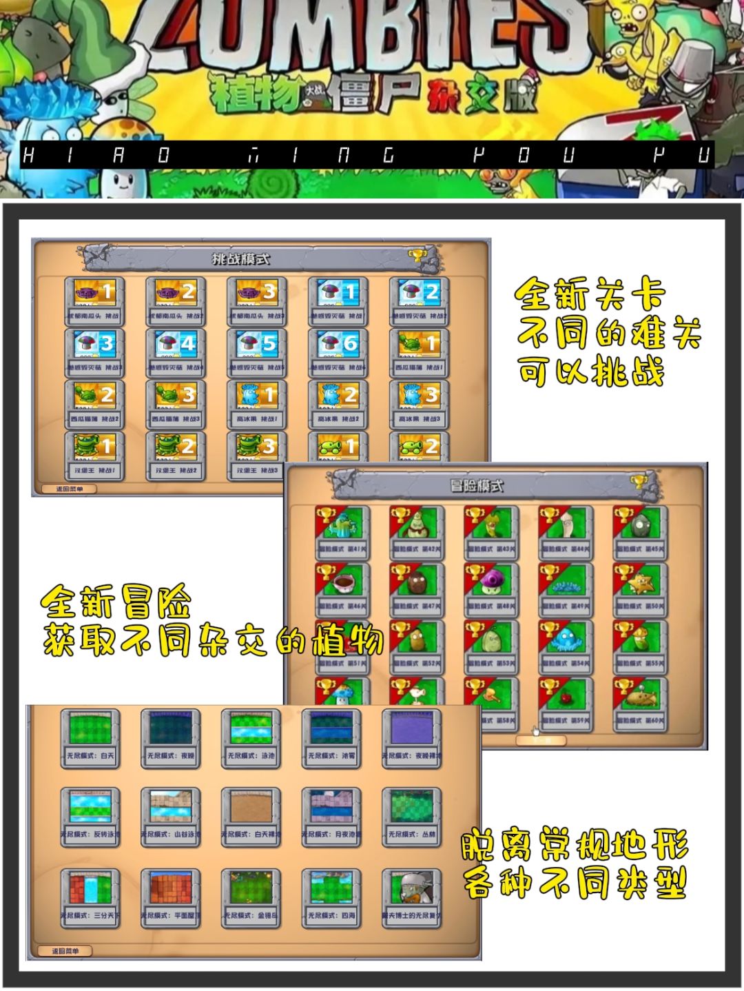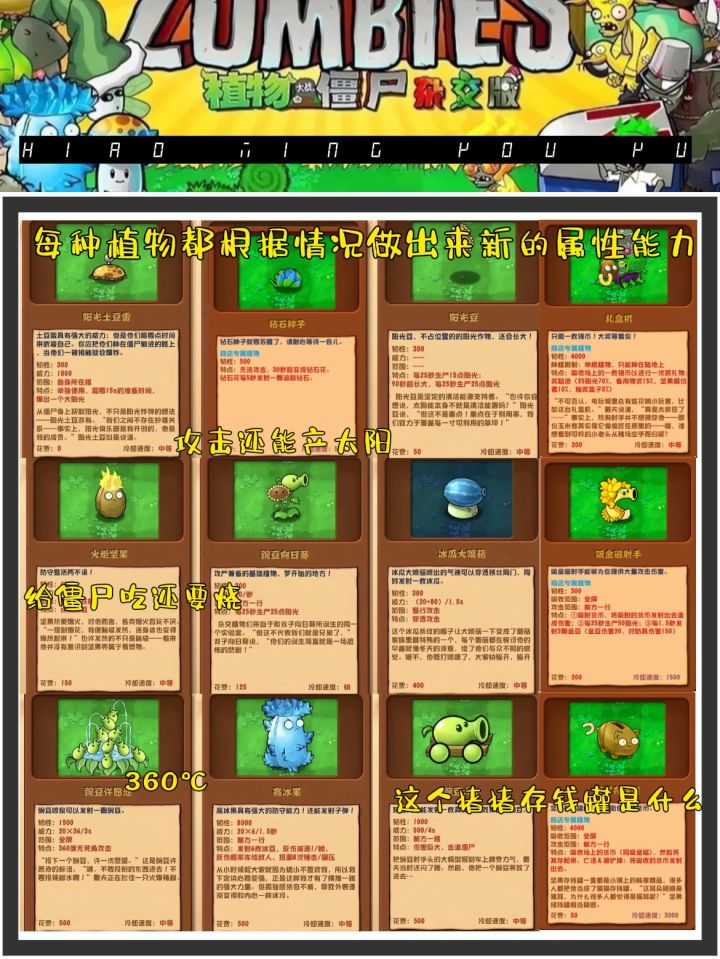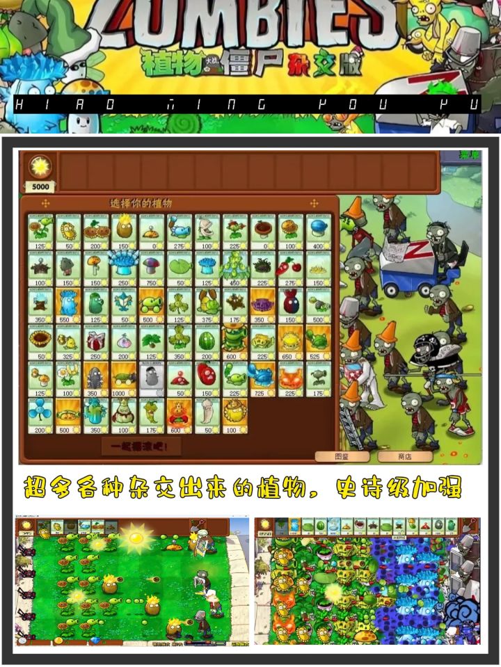 ✨游戏在保留了原版的同时,up对游戏进行了很大部分的调整,局内植物都以“杂交版”的形态出现。你有见过向日葵和豌豆绑在一起的嘛,就那种可以生产还可以守家的“豌豆向日葵”,直接让玩家摆脱了前期先种“向日葵🌻”还是“豌豆射手”的烦恼。直接一步到位。还有冒着火的坚果,坚果自带灼烧好了这回僵尸🧟♀️可以吃口热乎的了。再也不怕着凉了。