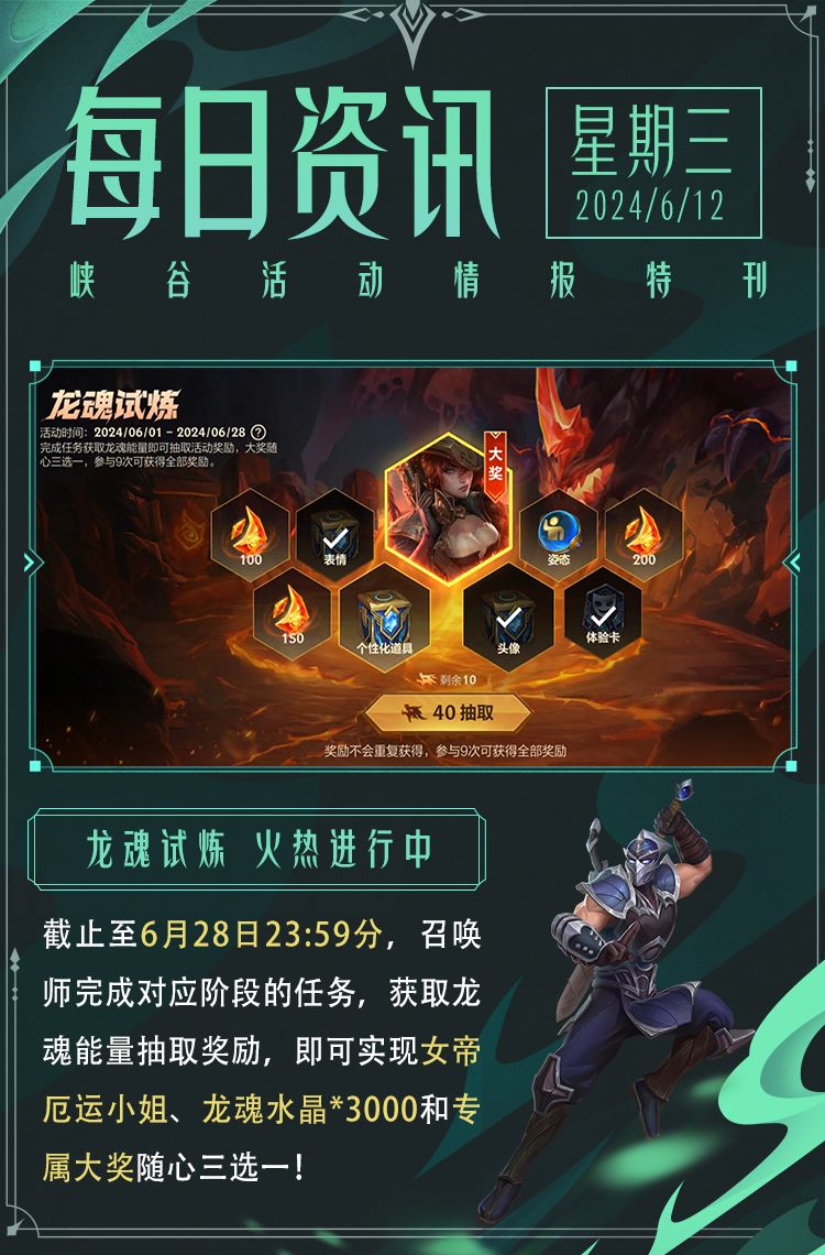 登录更有好礼可领!截止至6月14日23:59分,召唤师只需累计登录5天,即可领取海克斯护盾卡*3、龙魂水晶*300和精选个性化道具自选宝箱~