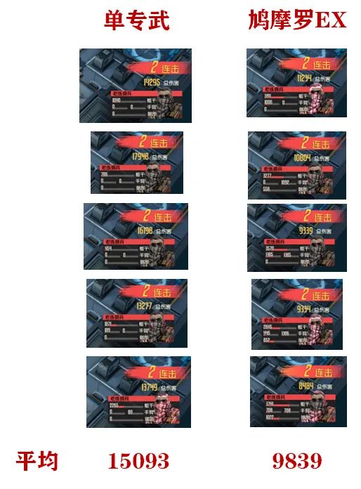这里维一用单专武+鸠摩罗EX和双鸠摩罗EX做了个对比,同样适用技能【双肩打击】,打击同一个敌人,看5次伤害的平均值来衡量其增量,那么最后测下来,专武这边的平均伤害为15093,而鸠摩罗EX这边的伤害测下来为9839,提升幅度高达53%,同样如果大家自己去做测试的话,可能结果会有一定的浮动,但这个大致的增益幅度还是可以参考一下的。所以从上边的实战测试大家就能发现,不同专武的提升的确有很大的区别,反正维一个人是先做了威廉的专武,然后再做奈奥米的专武,最后才考虑西尔维娅,大家也可以参考一二,当然有什么建议或者意见也欢迎留言来提出。今天的攻略文章就到这里,如果大家还有任何问题的话都可以添加维一的私人微信heerweiyi1015进行问询,感谢大家的支持!