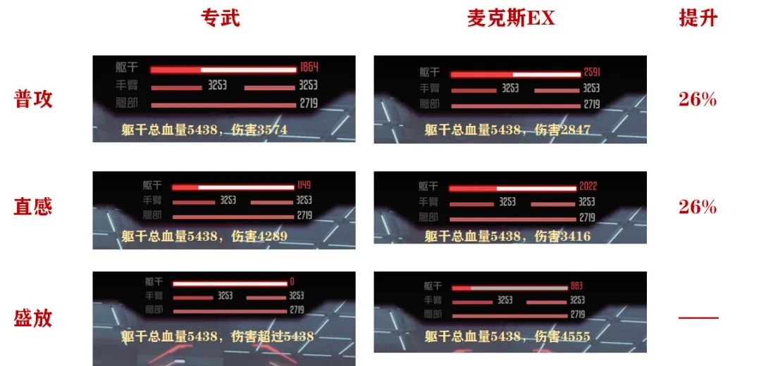 我们分别用专武和麦克斯EX这两个武器来攻击某关卡中敌人的躯干部位,如上图所示,在常规的实战搭配下,带专武所能实质提升的伤害幅度大概就在26%上下,当然大家去测试的话,由于测试环境和前提等因素不同,可能会有些许的浮动。同时考虑到西尔维娅目前可能有点尴尬的大环境,所以她的这个专武所能带来的实质性提升相对是需要斟酌的,此外在移动力方面的提升,这个专武的确也比较夸张,但客观说西尔维娅也并不是很缺移动对吧......