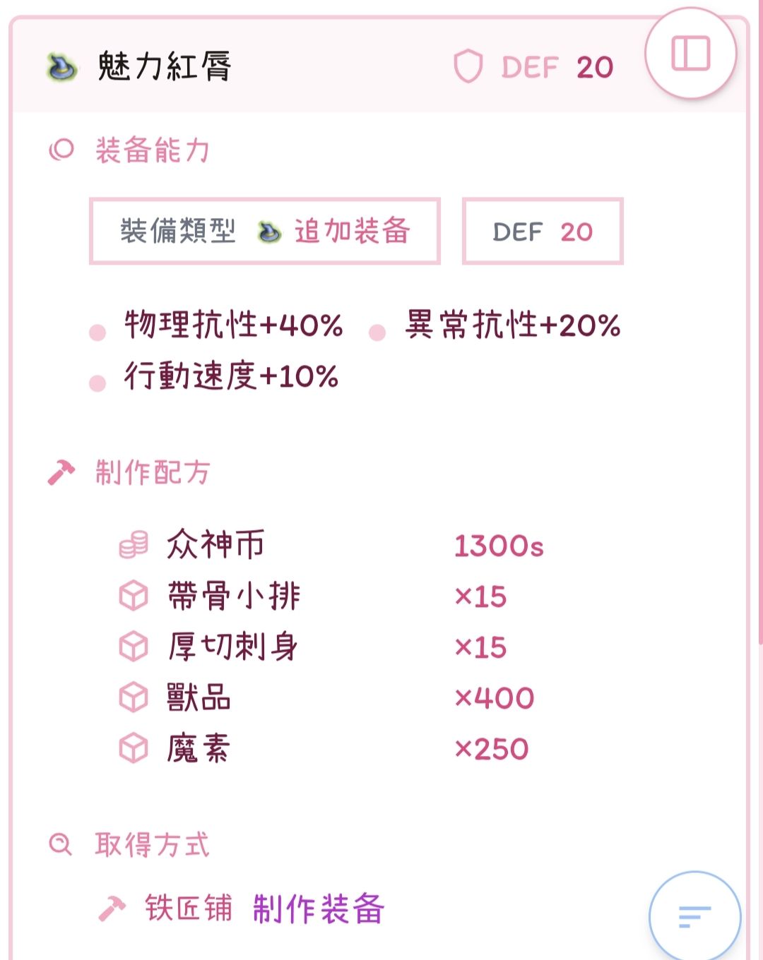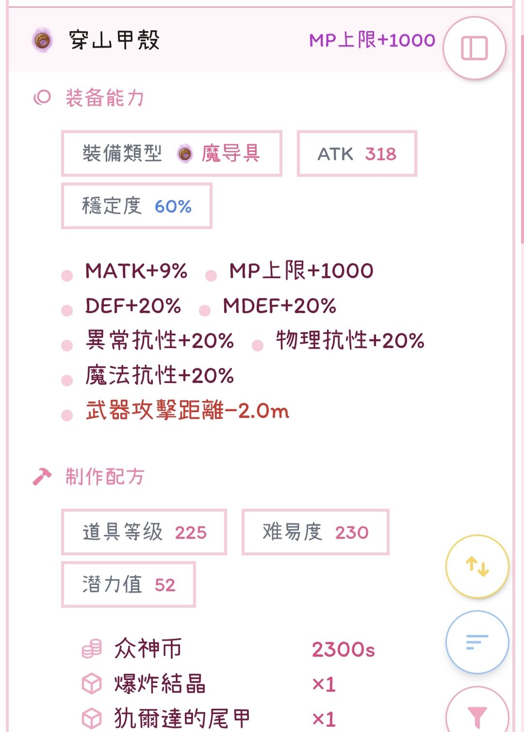 无孔铁匠铺穿山甲壳魔导具,还能精S给材料终结使用,不过我还是推荐材料气旋啦,前期萌新没钱可以用材料终结过渡,终结美丽的数值会拯救每一个落魄的萌新~