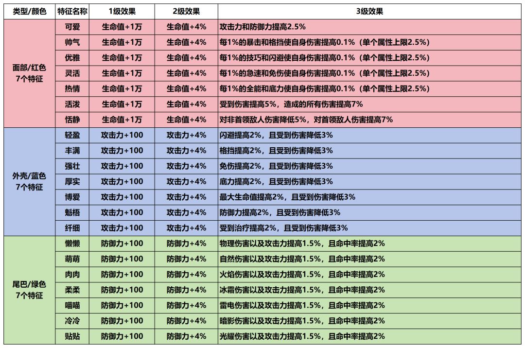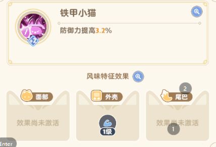 我们最多可以上阵4个猫猫,每只猫猫按照5个风味特征来计算,每个部位就可以激活20种特征,理论上可以激活一个3级效果+一个2级效果或二个2级效果+一个1级效果。