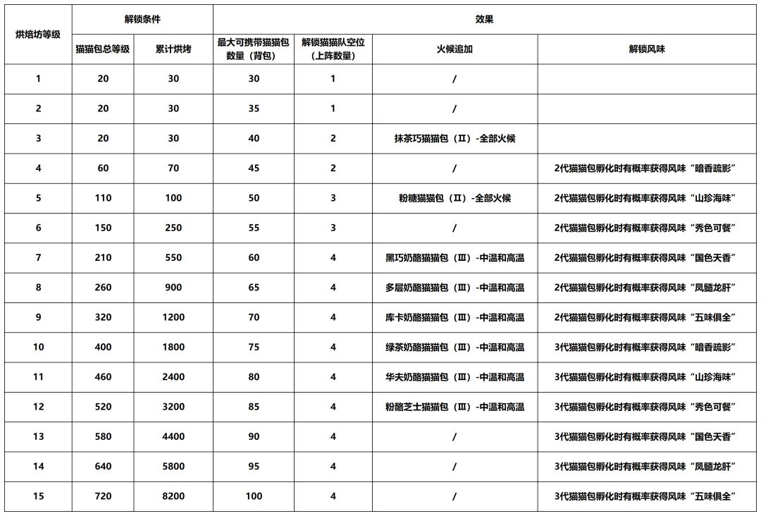 1、家庭烘焙坊:提升烘焙坊等级,可解锁猫猫队的空位(可上阵猫猫包的数量),猫猫包的产出概率,猫猫包的最大可携带数量(背包容量)、猫猫包的种类