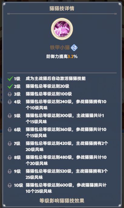 3、猫猫包技能:只有主战猫猫包的技能可以生效,携带后即可生效;技能等级与猫猫包总等级、主战猫猫包的风味等级、参战猫猫包的风味等级有关