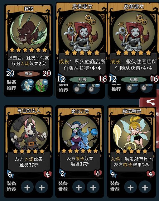 阵容搭配:金野猪+金发条淑女×2+金泉水之灵+金魔法精灵+金狗头人