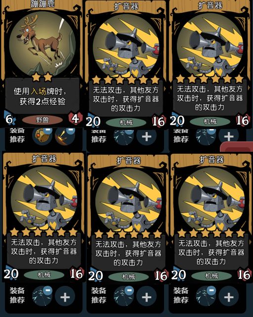 阵容配置:统一使用初始属性,金鹿装备一件焊接器和元素手镯,所有金扩音器装备一件飓风法杖(其他友方攻击时,本随从获得其一半攻击力),回合后对金鹿使用技能攻守兼备(使一个友方获得+1+1,然后令其攻击或生命增加,直到二者相等)