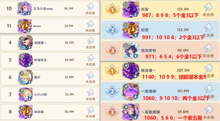 这里统计三区榜单,从顶氪到普通玩家正好能在榜上一一对比。