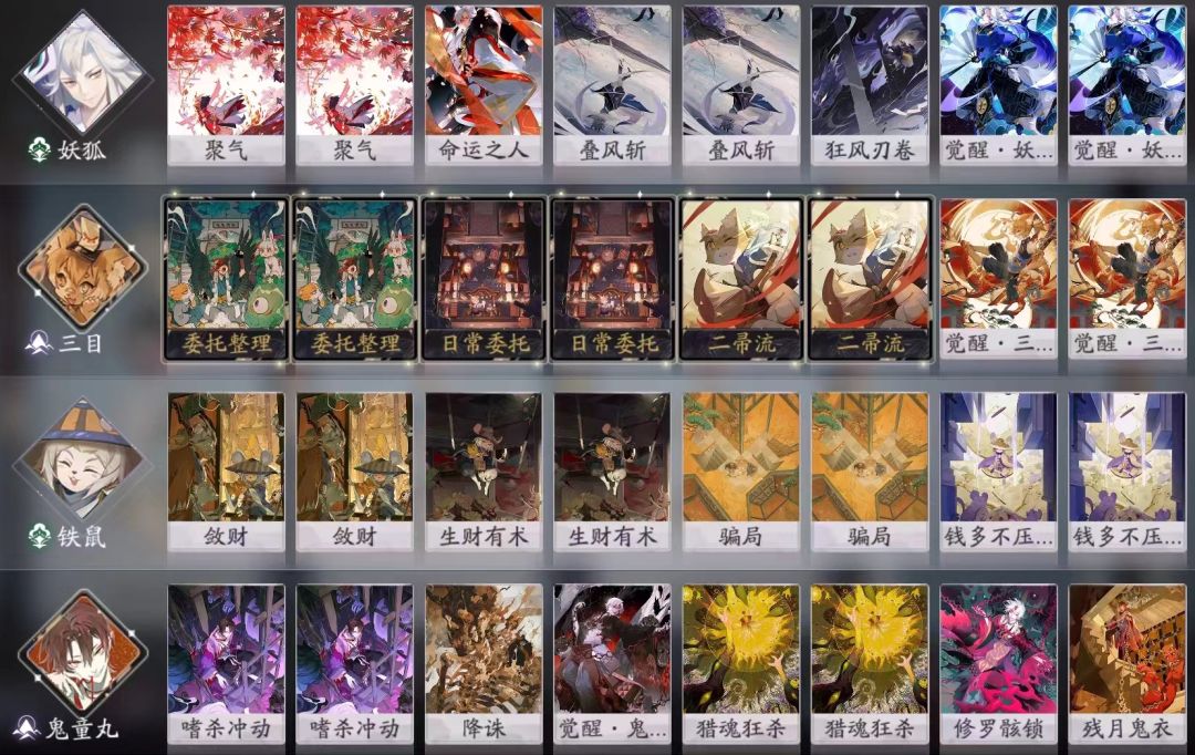 思路很简单,铁鼠被动能完成三目日常委托,妖狐觉醒能配合三目觉醒不消耗鬼火(铁鼠SSR也可以,但是太拖沓)。