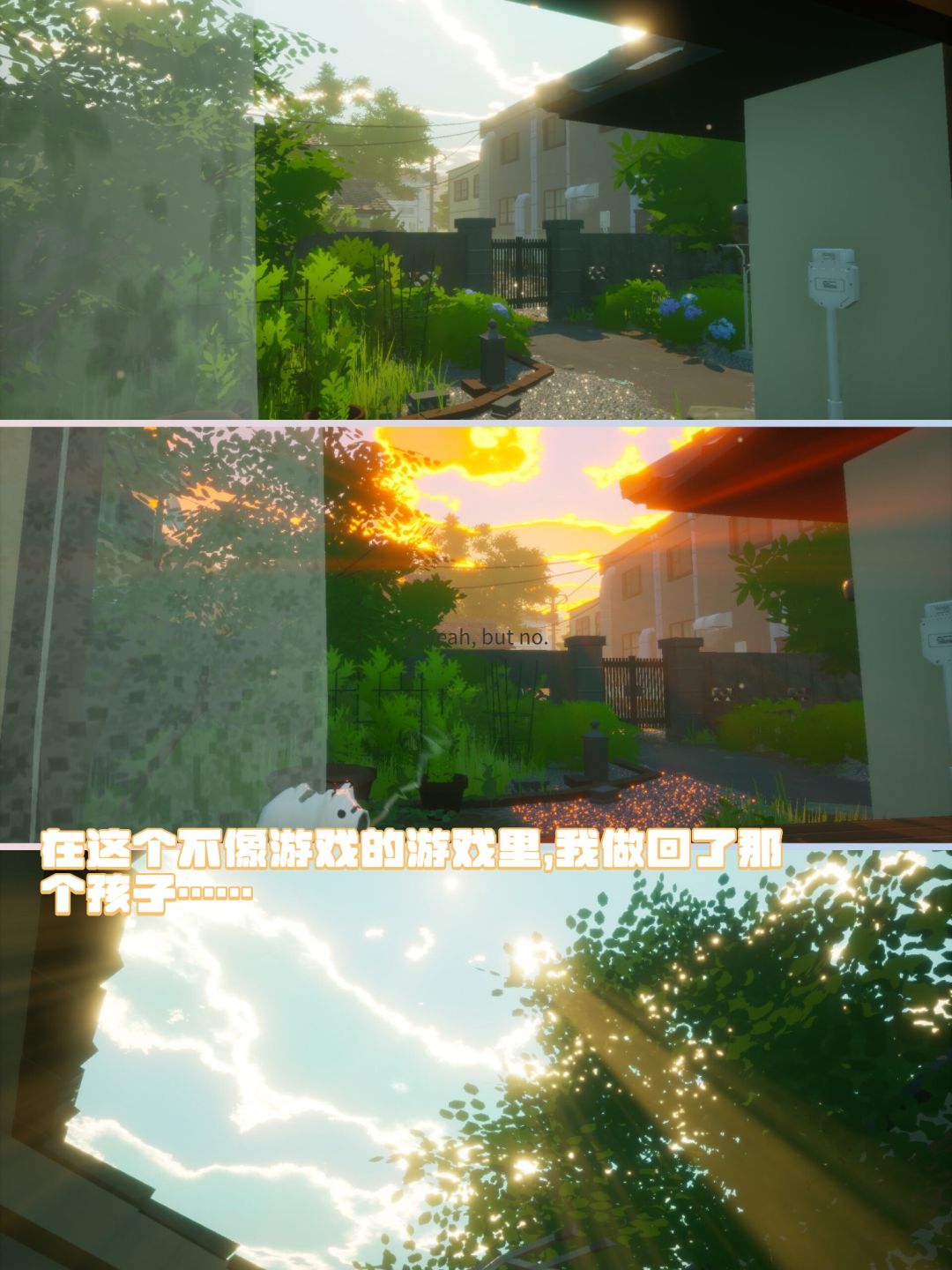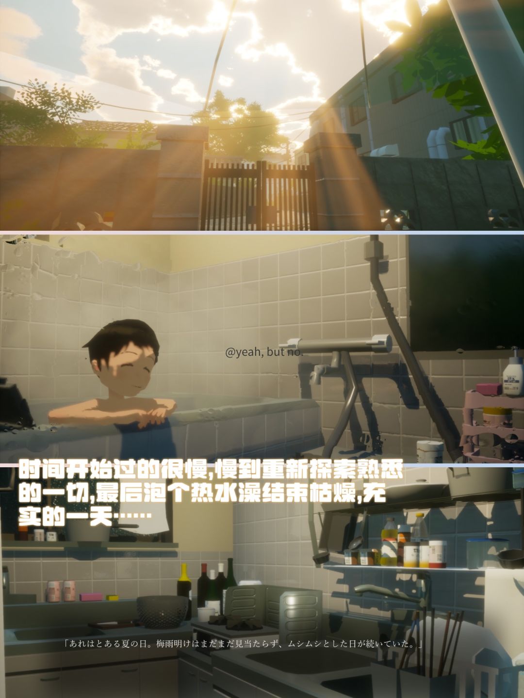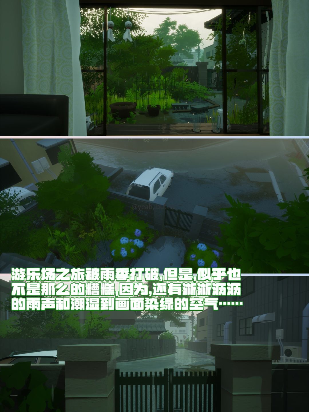 🌿整体就是非常小清新的日系养生步行模拟器,以40分钟的简短篇幅成功引起了我这个常年漂泊的蒲公英的共鸣,通关之后突然想回家看看了...其实游戏本身没什么剧情,就是一个非常平凡普通的梅雨季宅家日,但其间穿插的6个白日梦,体量虽小,但还是给人带来了一点意料之外的小惊喜!