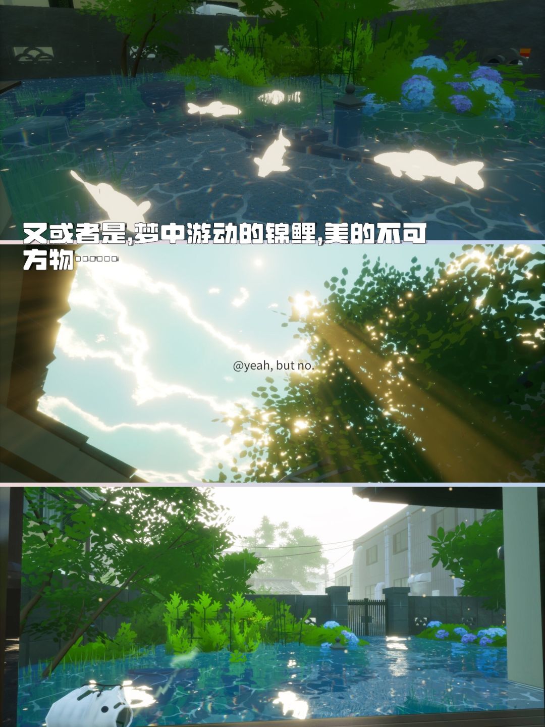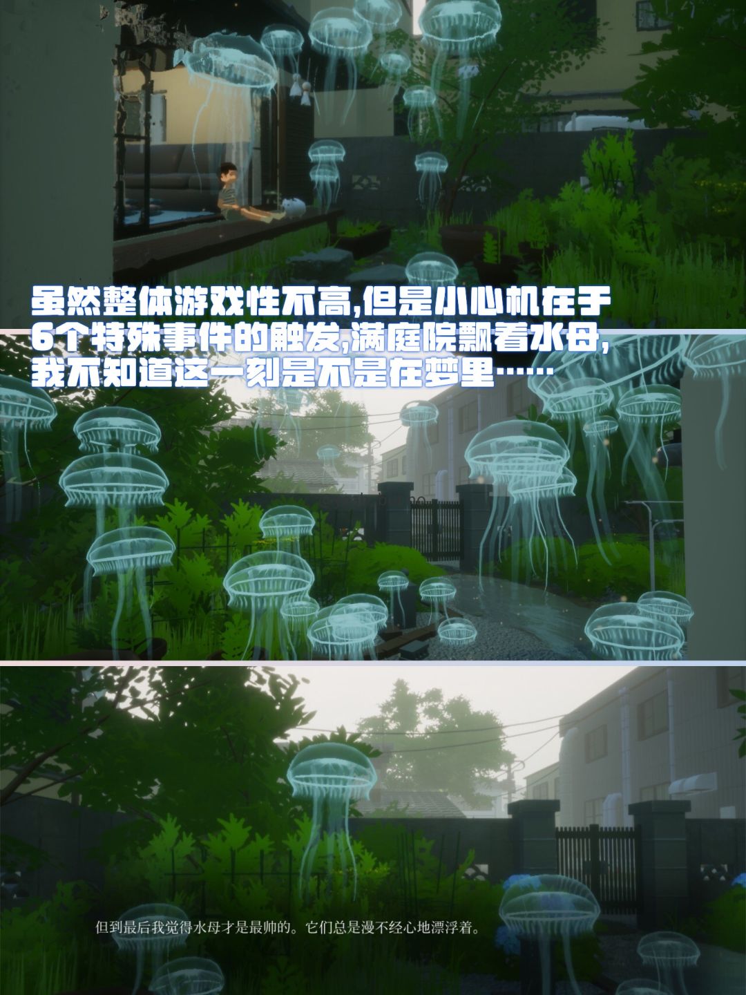 百无聊赖之时,就会发生一些特殊事件,空气中漂浮的水母🪼,和庭院里闪光的鲤鱼...淅淅沥沥的雨声和极附生活气息的bgm所带来的沉浸感是非常出色的。