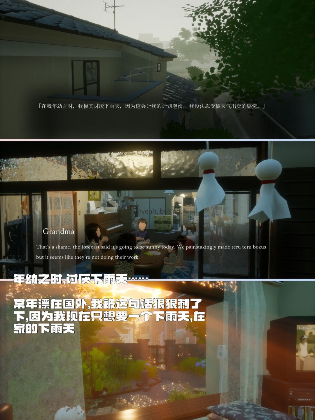 与其说是在玩游戏,不如说是在和曾经言谈,雨水划过房檐的声音,潮湿空气里浮想联翩的思绪......开始好奇地打量、触碰着房间里摆放的东西,随意的对话、想象,吃猪排饭、看电视剧、泡热水澡,伴着雨声冲掉一切疲惫...