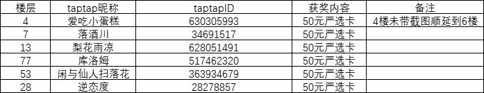 恭喜以上幸运玩家中奖!辛苦各位玩家在七个工作日内添加联系方式QQ:565469107,添加时需要备注【TapTap+游戏名+活动简称】兑换奖品哦~(7个工作日内没有联系工作人员视为放弃奖励)