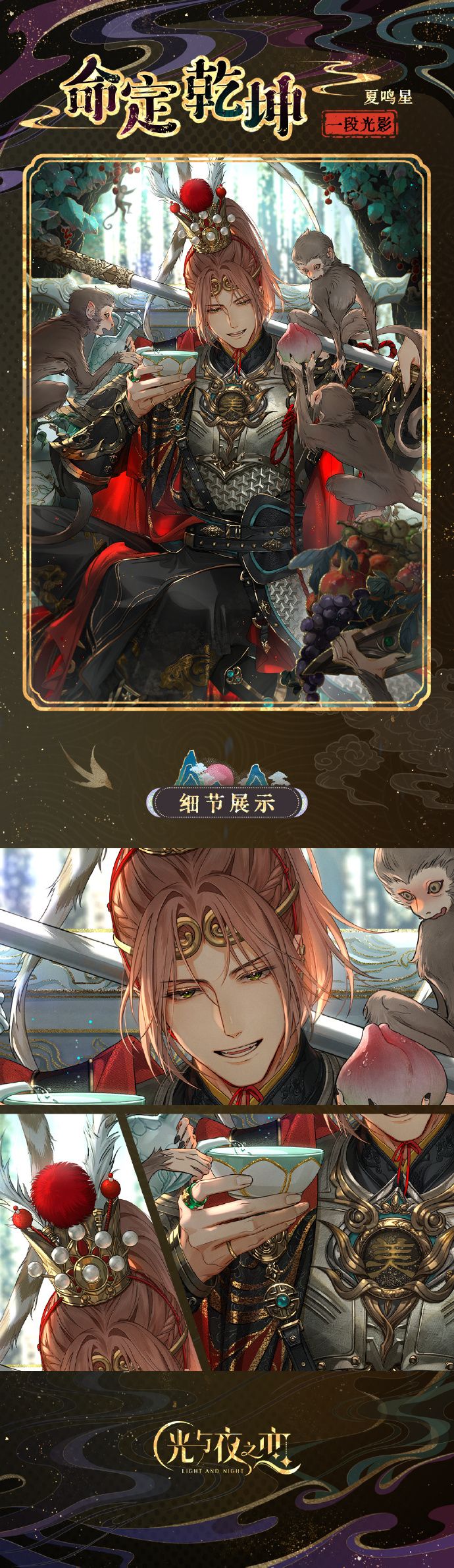 [6星]灵犀 夏鸣星・命定乾坤 属于[纪念灵犀・瑰意]系列,二段光影为特别纪念横版卡面,在游戏内灵犀详情界面,点击左上角放大镜【查看大图】即可鉴赏完整卡面。