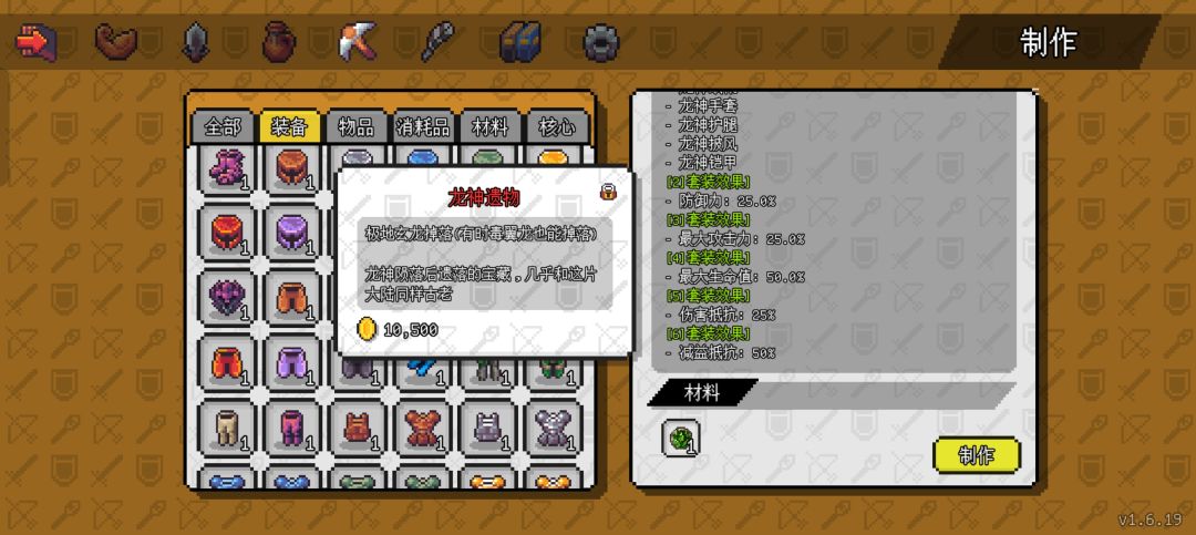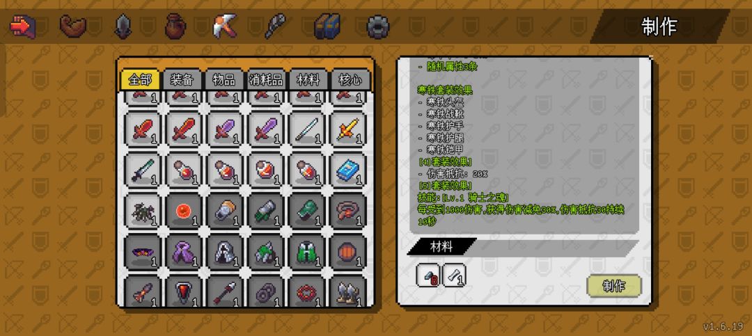 这个游戏的装备合成系统没有提示,萌新肯定要足够细心才能发现,游戏界面左上角点开,找到“锄头”那个界面,白底的装备就是材料已经具备,可以直接合成。黑底的装备是部分材料具备,需要进行收集才能合成,没收集好的或数量不够的,点开右下角就是红字。(如下图)