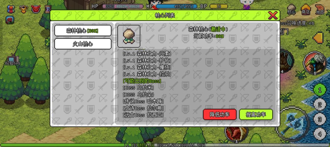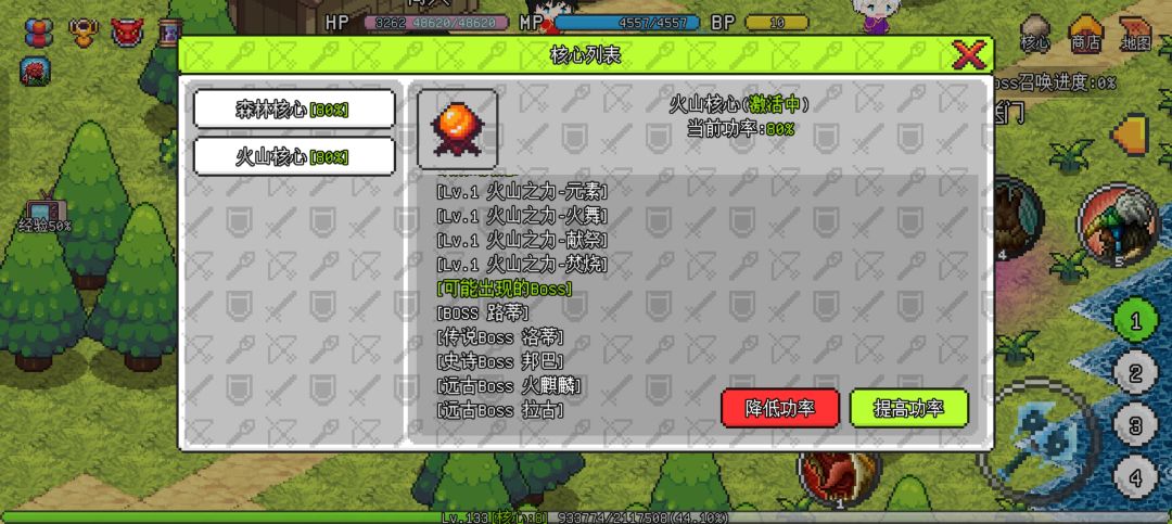 从1转开始,就可以开启屏幕右上角的“核心”玩法了,每重生1次可以激活核心10%,打败核心boss掉落高级装备+核心,森林boss掉落森林核心,火山boss掉落火焰核心,其中森林核心+火焰核心可以合成火藤核心。