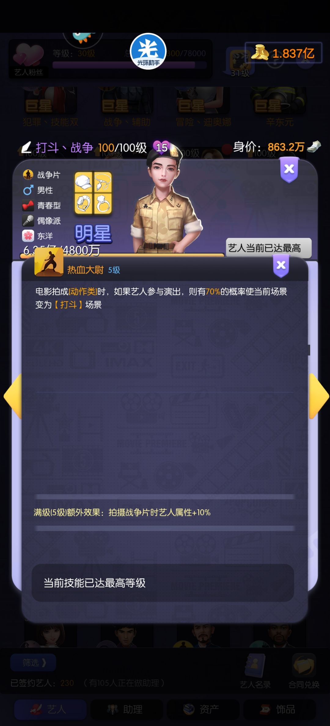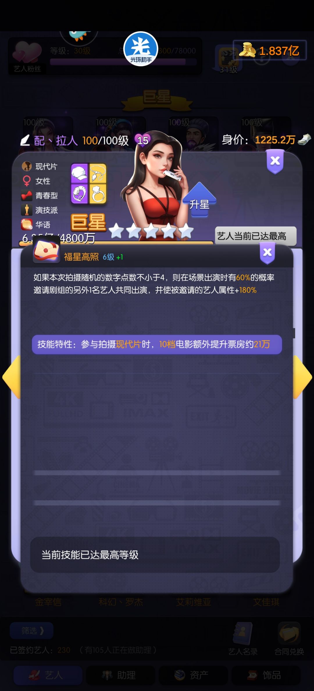 专属第一个先做冒险艺人丹尼尔,这样打斗场景也可触发旅途。第二个小白,优先红也是小白。其次小青,顾长歌,东方。诸葛出来第一时间搞到,提升非常大,可以让传奇非常稳定,没他之前全靠脸,有了之后拍古装神本传奇概率大大提高。拉人用现代艺人,因为她是华语系艺人而且比雷好用的多。古装有两神本,一个笑傲江湖,一个黑卡本。黑卡本非常强,看阵容评分就知道。这游戏基本没花钱,全靠喜爱,玩到毕业。从票房大卖王玩到影业梦想家也有七八年了,希望游戏团队以后可以越做越好。