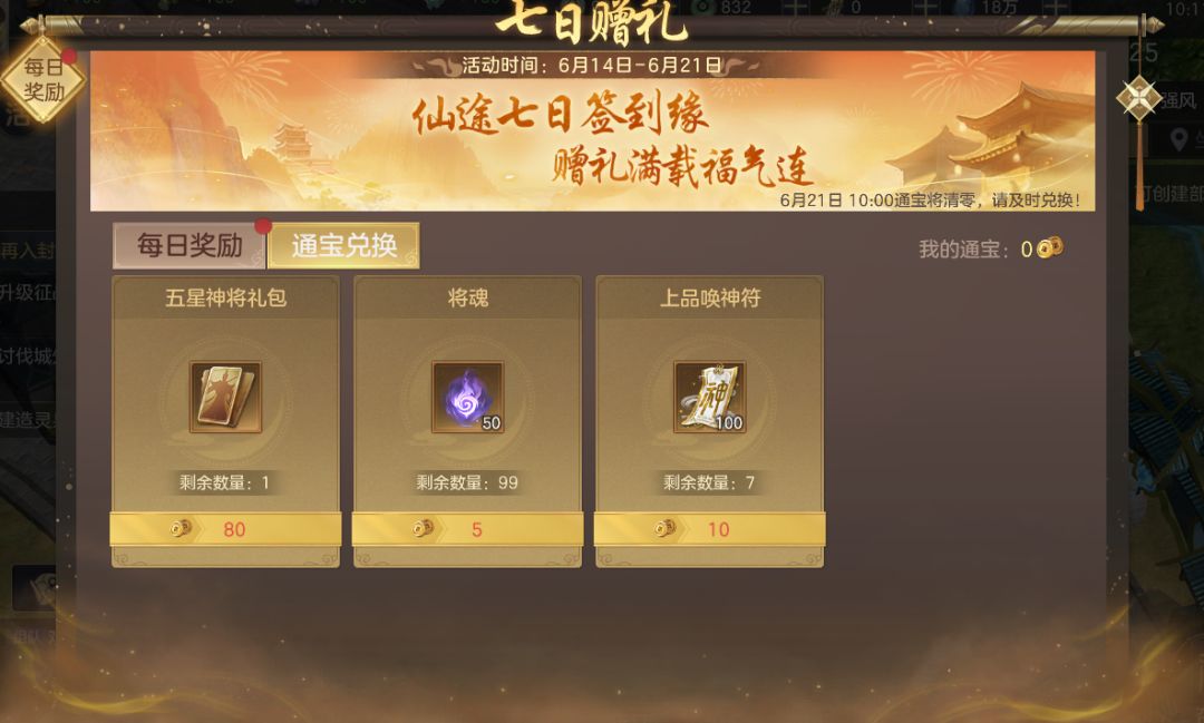 本次更新中,宗主登录游戏,并完成日常活跃即可在每日奖励处领取通宝。通宝可以兑唤五星神将礼包、将魂和上品唤神符。整体活动可获得700上品唤神符、1个随机五星神将卡包和若干将魂。