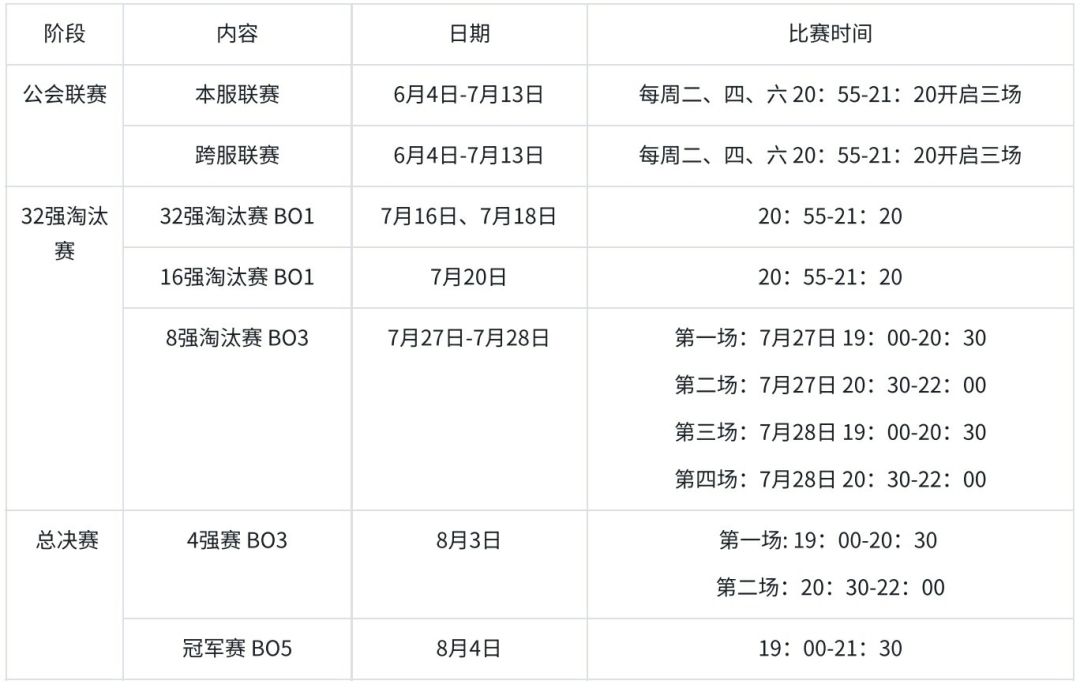 在6月11日-7月13日,公会联赛每周二、四、六20:55-21:20开启三场,每周根据三场的胜负决定段位内公会排名