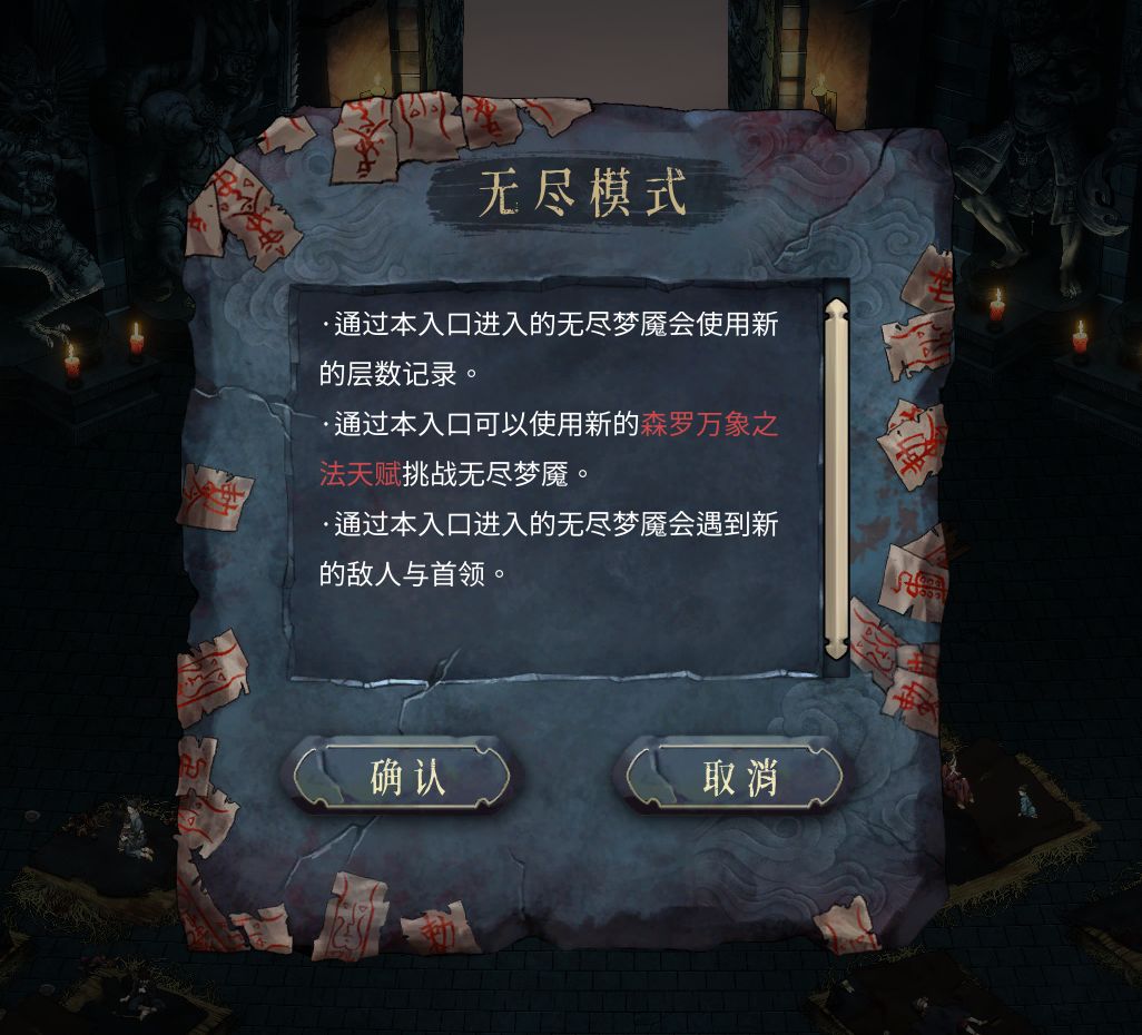 在终业DLC中,增加了直接进入无尽模式的入口,在选择流派后,佛堂大厅正中地上会有一道裂缝,交互即可进入终业无尽模式。该模式下会包含游戏内的所有关卡和boss,且使用DLC2的天赋系统