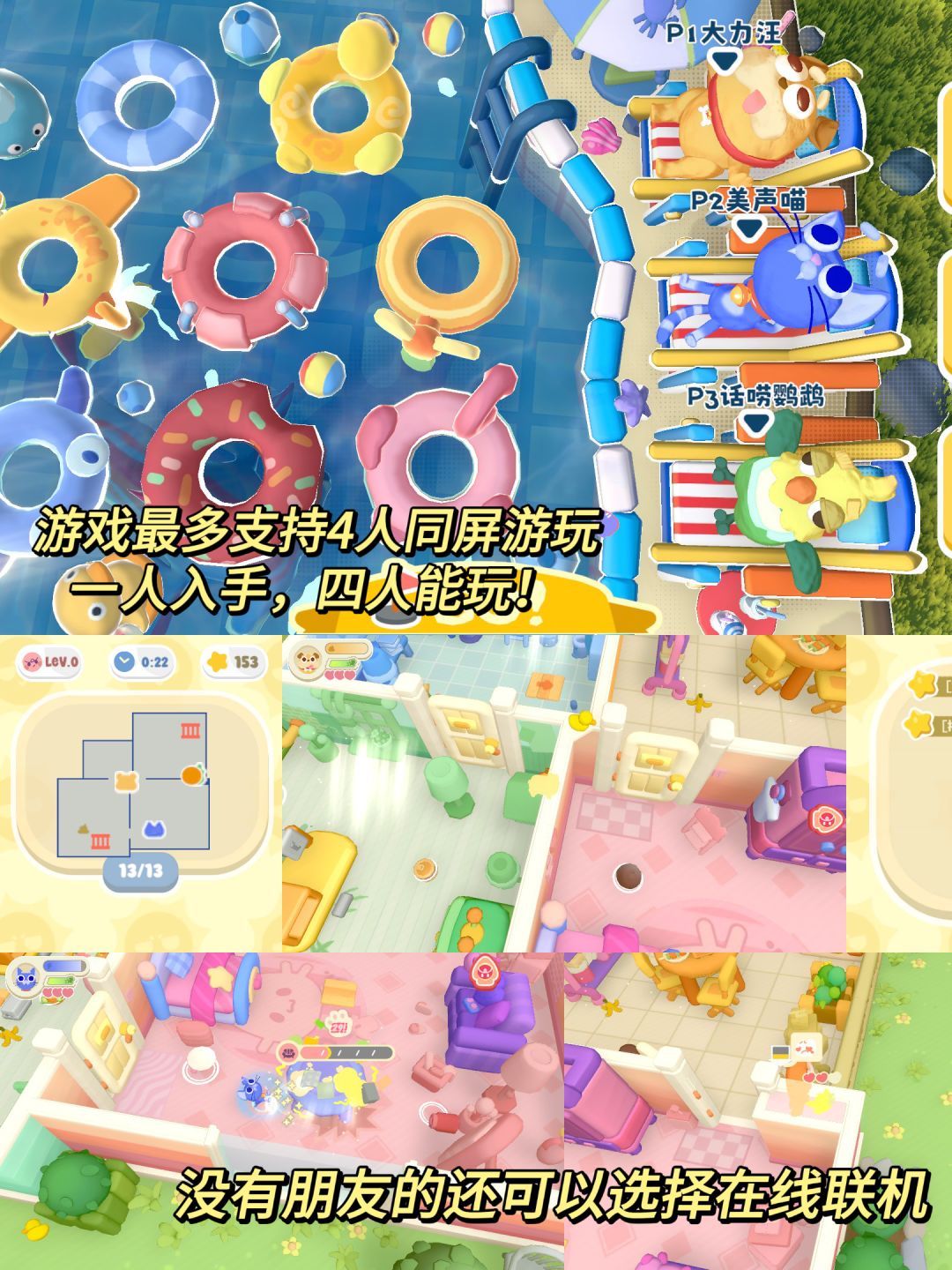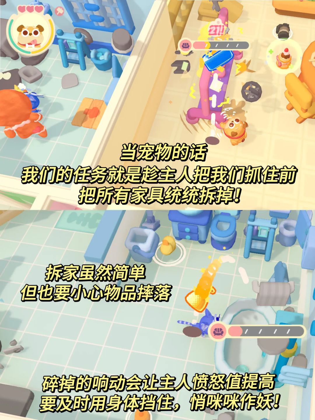 游戏里我们可以和朋友们一起联机当宠物,趁主人不注意偷偷搞破坏!也可以扮演主人,四处追击不乖的萌宠们。
