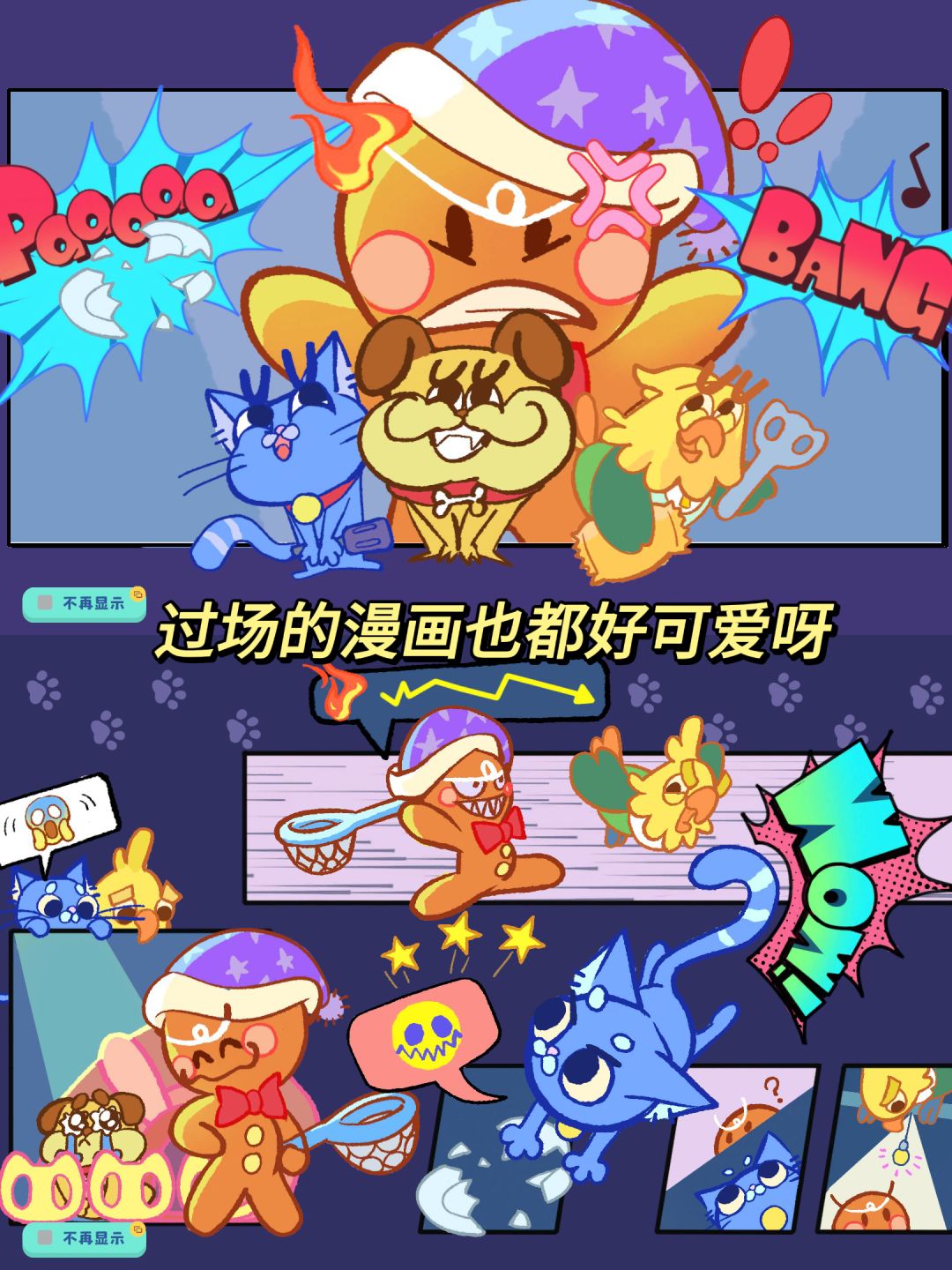 游戏的画风超级可爱,像是在温馨的糖果屋里玩耍。不仅宠物贱萌贱萌的,主人也是可可爱爱的姜饼人,挥舞着棒棒糖四处追赶。