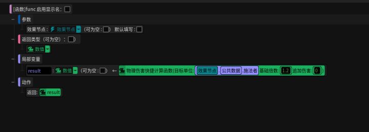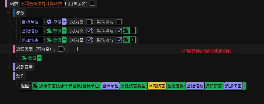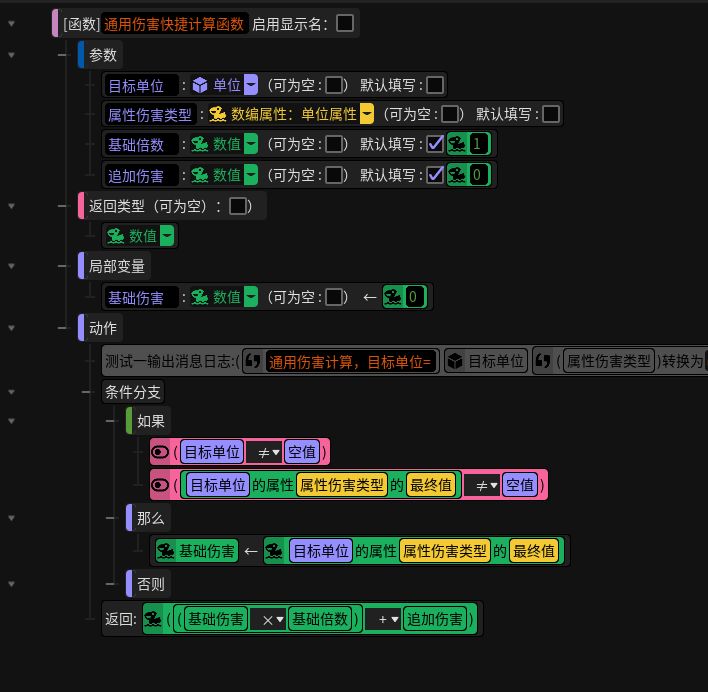 首先在触编里创建通用伤害快捷计算函数,然后在数编伤害公式或任意用到的公式计算的地方调用即可,也可以拓展修改其他属性,如物理属性等。