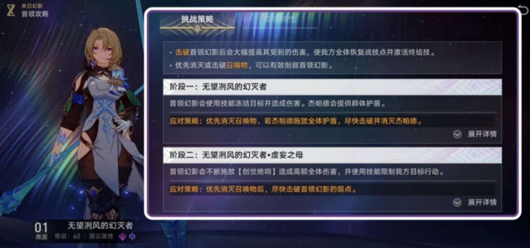 每期「末日幻影」将会更新2个首领的投影,分别镇守节点1和节点2,关卡分为4个挑战难度。挑战并击败2个首领即为完成当前难度挑战,可以领取奖励。此外,达到特定的分数还可以获取额外奖励。