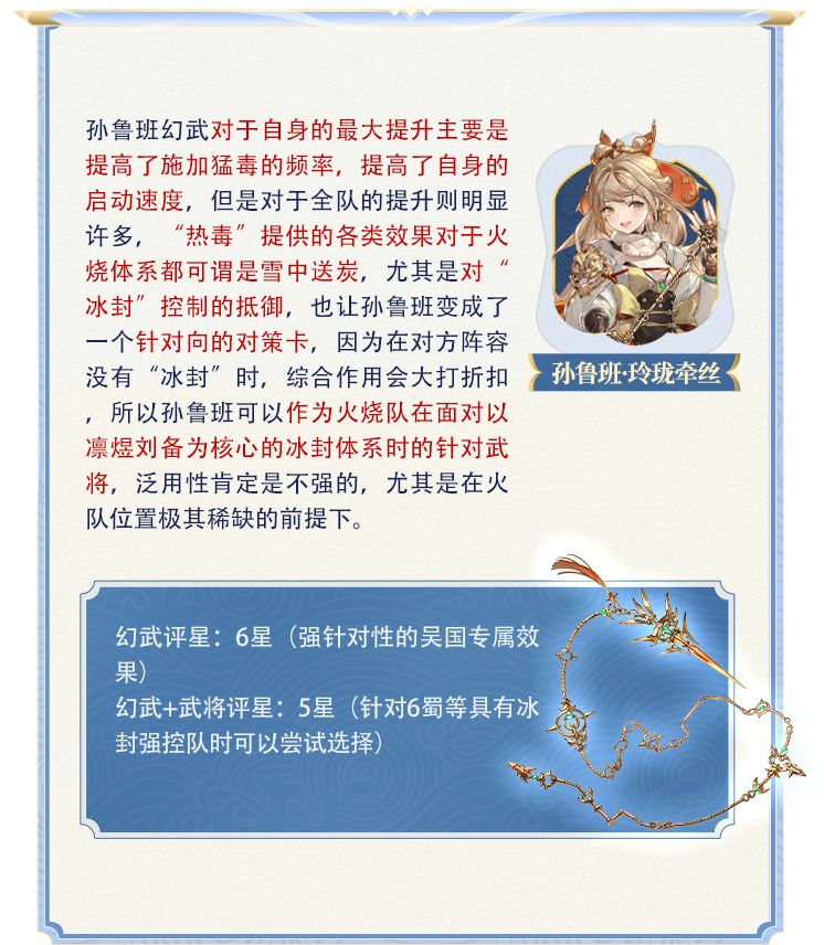 小将军们好~新一批专属幻武上线后,玩家@幼崽 做了技能解读和武将分析,并且对幻武做了星级评价,希望能对大家有所助益~