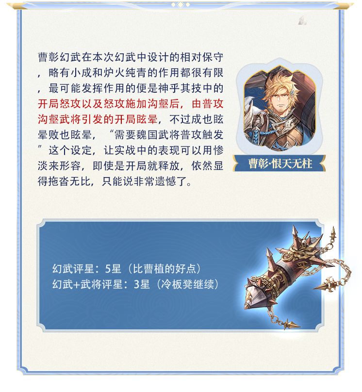曹彰和曹植一样,随着脏水队的落寞而坐穿了冷板凳,缓慢的启动速度,不高的数值,中庸的机制,版本的不适应,都成为了曹彰无用的原因,专属幻武需要有足够的新功能,才可能拯救曹彰。