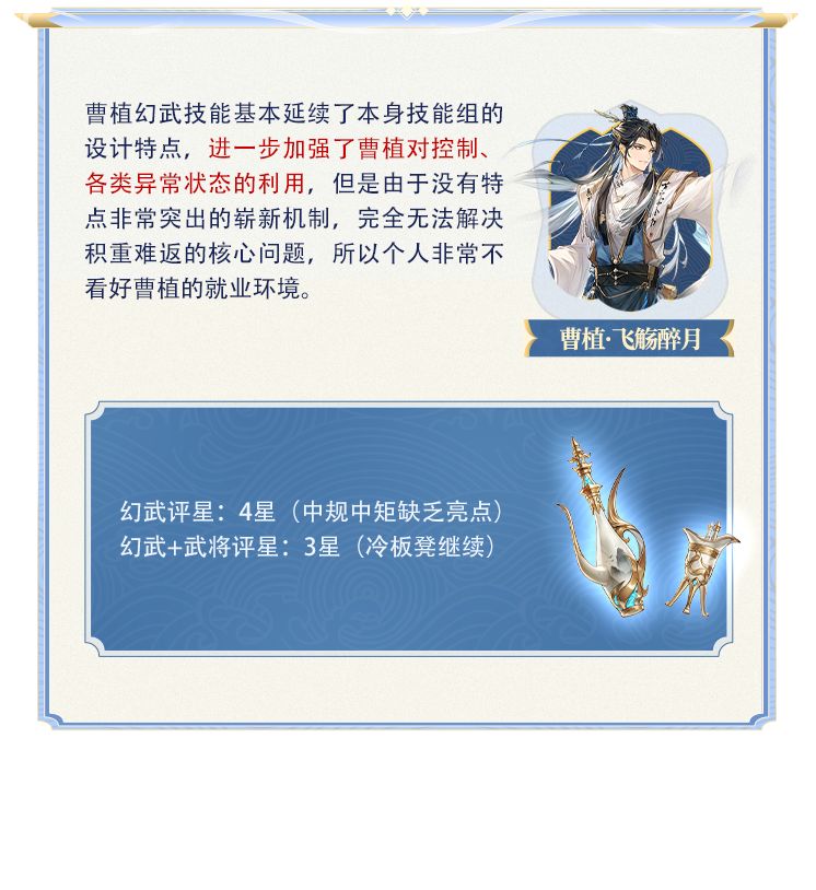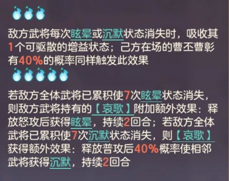 强化曹植对对方buff和debuff的利用效率,强化曹植对眩晕、沉默的使用效果。