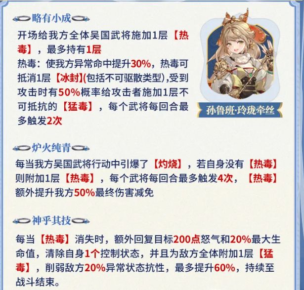 让略有小成中强大的“热毒”buff可以续上,从一次性变为四次,妈妈再也不用担心我们火烧害怕凛煜刘备啦。让“热毒”变得更强,能提高全队坦度。