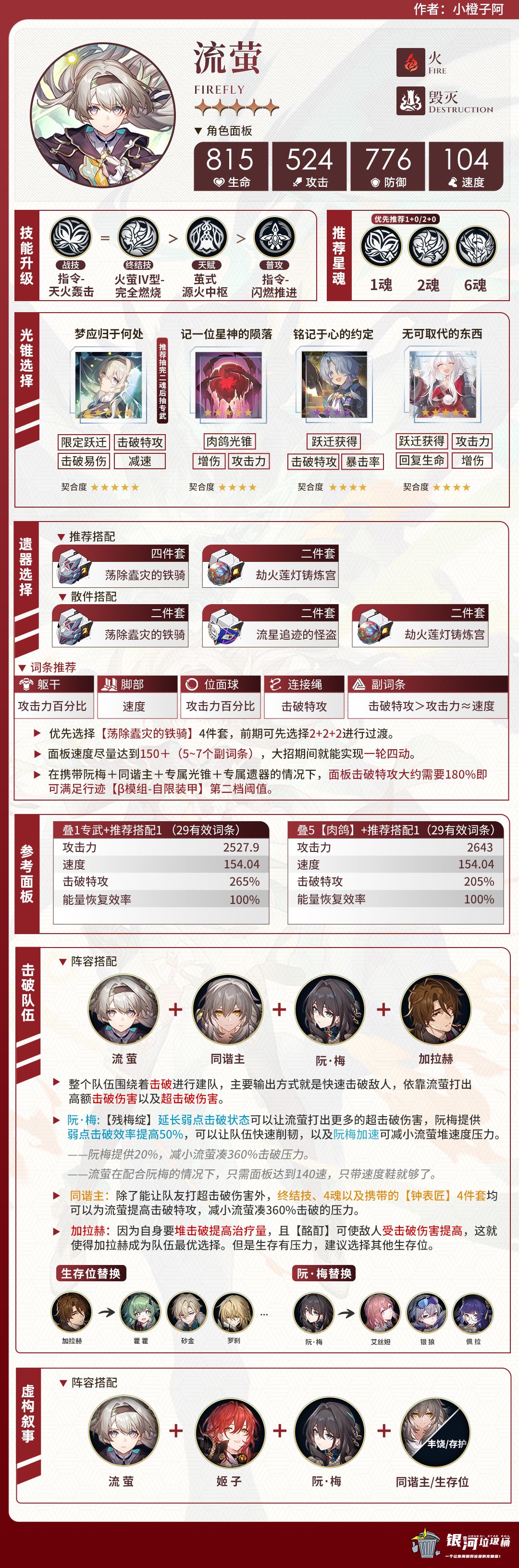 「流萤」是一位火属性的毁灭命途角色。作为毁灭命途的流萤,主要的输出方式就是依靠终结技变身高频率释放强化战技来打超击破伤害,毫不为过地说,流萤就是当前版本最强的击破大C,天生超击破圣体,完美符合打超击破的所有条件。