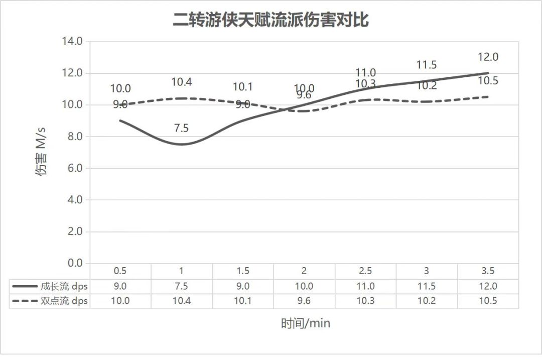 双点流能全程保持稳定的秒伤,波动不会太大;成长流在两分钟后秒伤开始反超双点流,龙副本的时长为三分半,伤害提高了15~20%;