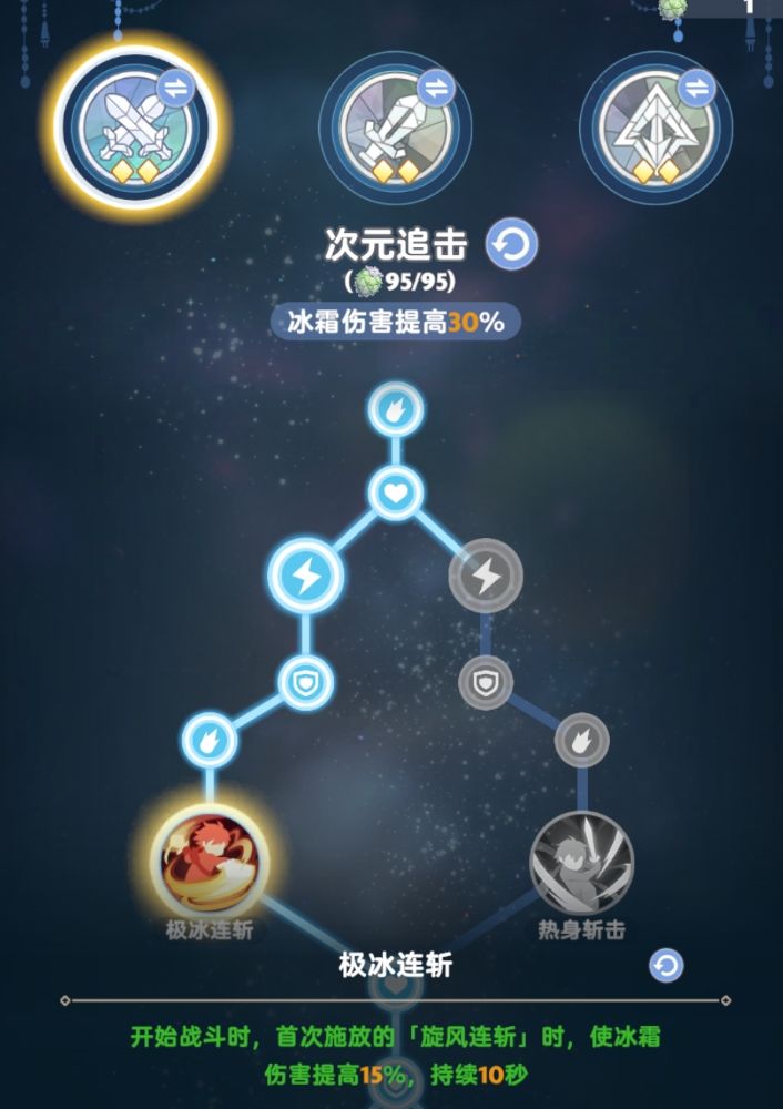 这里选择左线【极冰连斩】的原因在于,由于核心技能【次元斩】的效果,剑士的普攻将会转化为冰霜伤害。同时他的所有主动技和被动伤害,都是冰霜伤害,所以左线的加成更多,所有技能都能吃到,而右线仅仅只是对普攻和核心技能有加成。