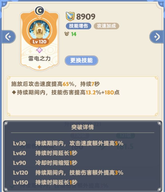 雷电之力可以说是剑士二转的另一关键技能,朴实无华的大量攻速加成,最高可到达70%,同时在持续期间也会有一个驻场伤害提升的效果,能大幅提升剑士的输出,同时快速叠加【看破】