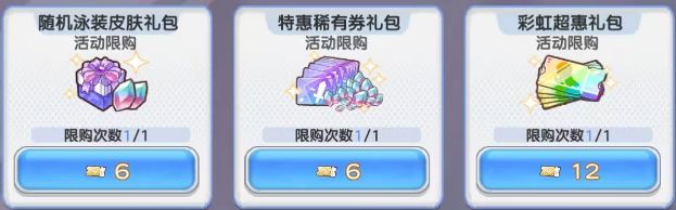 随机泳装皮肤礼包(6代金券)、特惠稀有券礼包(6代金券)、彩虹超惠礼包(12代金券)、皮肤卷大礼包(18代金券),合计42代金券