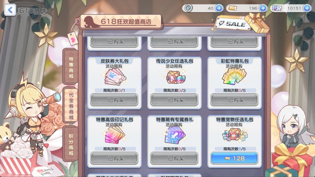 参与登录签到(18)、翻牌活动(15)、累消返利(7)共可无门槛获得40代金券,建议用来购买各种惊喜礼包,看看能不能触发惊喜。