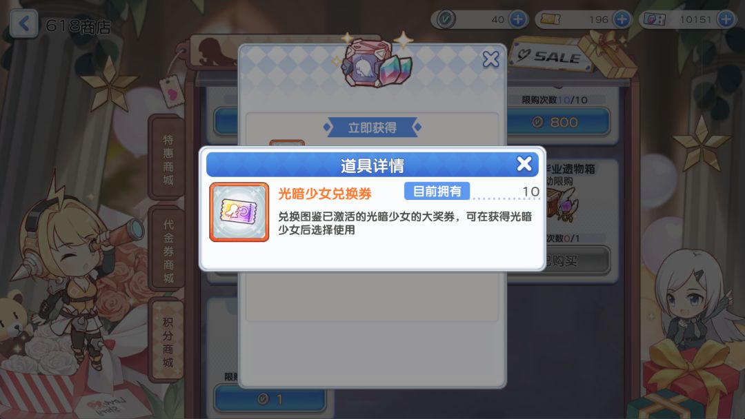 1、建议拿下积分商城的光暗少女兑换券,需要2000积分,需要在代金券商城消费400代金券