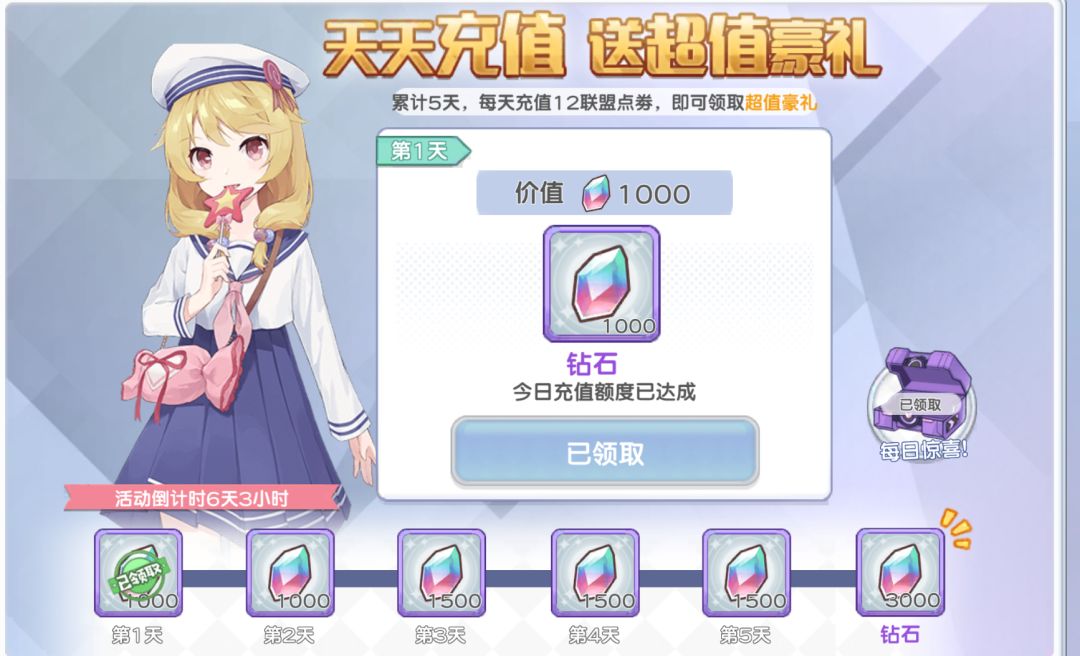 建议分四天充值,比如今天1+6+6充值13元,接下来三天每天12元,可以凑每日累充获得钻石,最好第五天再补12点券拿最终奖励(第五天的奖励合计4500钻石)。