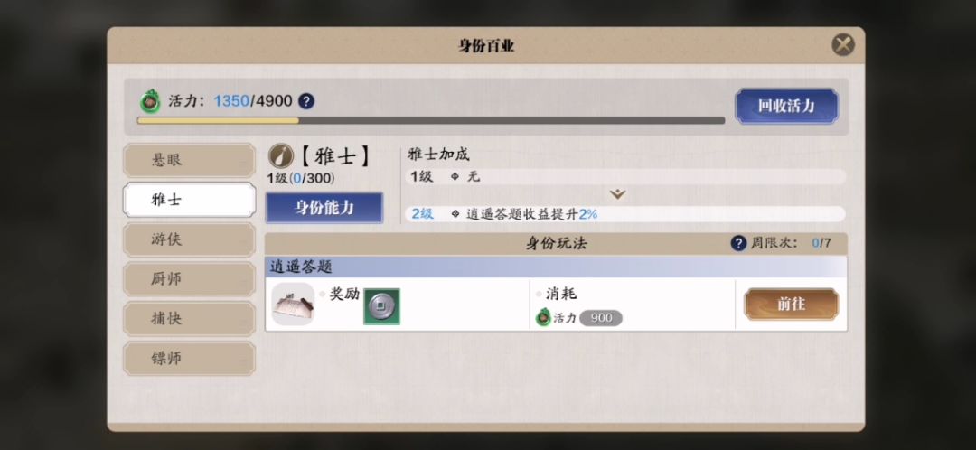 在身份百业里找到雅士身份玩法,消耗一定活力值就能开启一组逍遥答题。