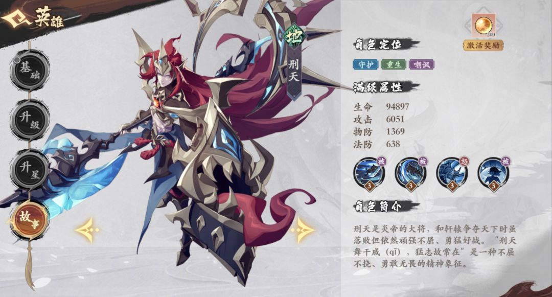 角色介绍:刑天是炎帝的大将,和轩辕争夺天下时虽落败但依然顽强不屈、勇猛好战。“刑 天舞干戚(qI),猛志故常在”是一种不屈不挠、勇敢无畏的精神象征。
