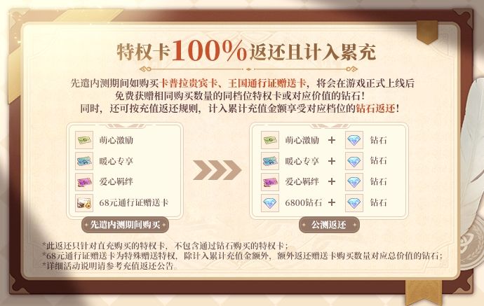 「先遣内测」期间如购买卡普拉贵宾卡、王国通行证赠送卡,在游戏正式上线后,将返还同档位特权卡。同时,购买特权卡的金额,还可按上述充值返还规则,计入累计充值金额。