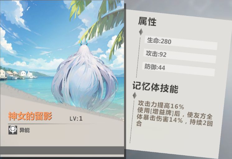作为印有女希形象,与女希同池UP的限定橙色记忆体,被称为女希专武。从数值上看,这个记忆体首先提供攻击力,是比较有用的属性提升,能够提高女希的伤害。接着是提供暴击伤害,让女希的伤害上限进一步提高。从功能上看,这个记忆体给女希带来的比较特别的提升是可以在使用[增益牌]后为全队增加暴伤。整体来说,这个记忆体的为全队带来的暴伤增益相当不错,非常适合女希使用。推荐二:橙色记忆体「白夜的星光(异能)」
