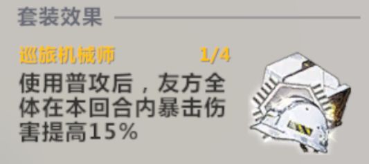 衣服词条推荐:主属性固定生命值,副属性偏向速度>攻击>暴击>爆伤>生命>效果命中>防御手套词条推荐:主属性固定攻击值,副属性偏向速度>攻击>暴击>爆伤>生命>效果命中>防御下装词条推荐:主属性固定防御值,副属性偏向速度>攻击>暴击>爆伤>生命>效果命中>防御头盔词条推荐:主属性推荐攻击力百分比=生命百分比>暴击百分比,副属性偏向速度>攻击>暴击>爆伤>生命>效果命中>防御 芯片4件套推荐2:[巡旅机械师],该4件套效果为普攻后加全队暴伤,非常适合女希