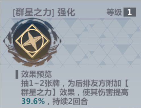 雇员简介女希是一名异能职业的风属性雇员,主要通过被动效果【阵锋】为后排增伤,然后通过技能牌【群星之力】多抽1-2张牌,并为后排增伤。