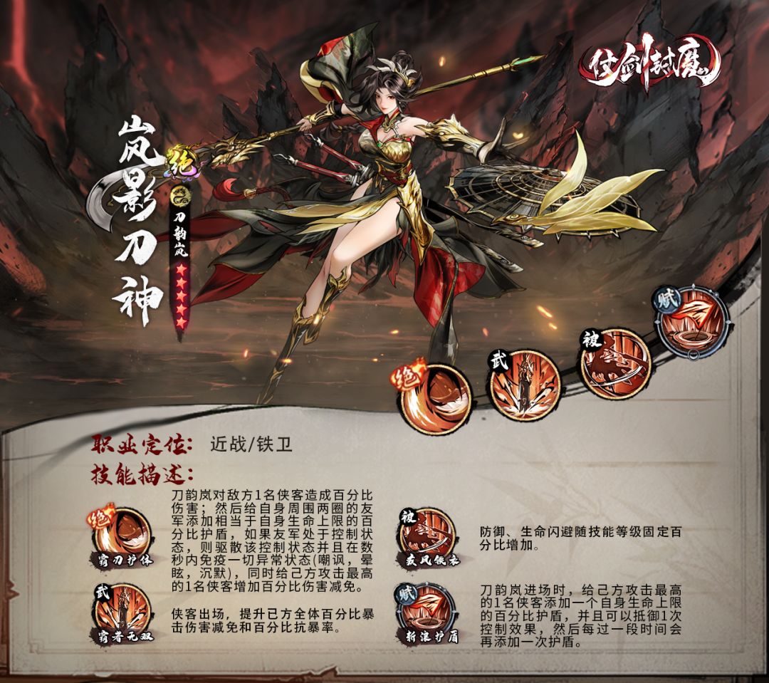 激活效果:刀韵岚释放绝招后,给己方全体侠客增加5%的伤害免,持续5秒。