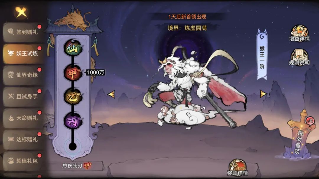 战斗中上阵兵家【敖天】可以提升全队弟子对首领的伤害,达到的伤害评级越高,奖励也会越丰厚。完成全部的试炼任务累计可获取